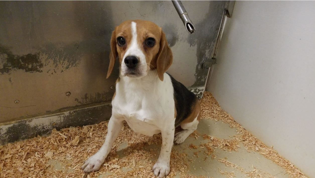 A beagle sitting in a barren enclosure