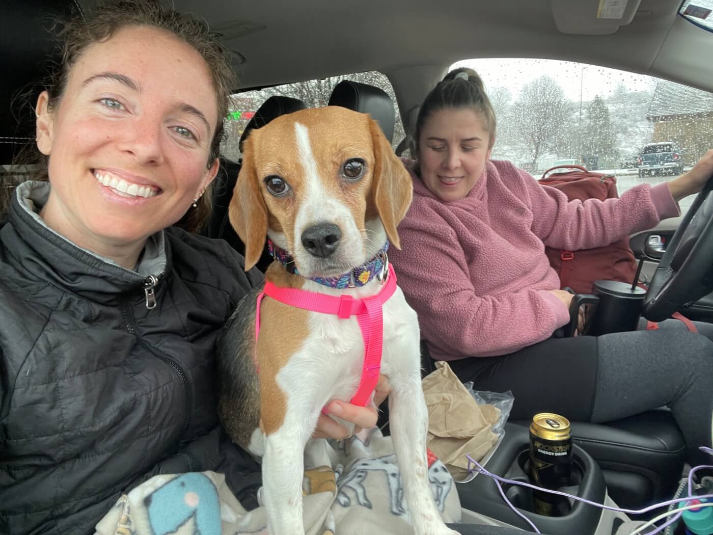 While it was a celebratory moment, no, that’s not a Guinness in my fellow PETA fieldworker’s cupholder … it’s a Rockstar energy drink—a must-have for a 35-hour-straight cross-country rescue road trip!