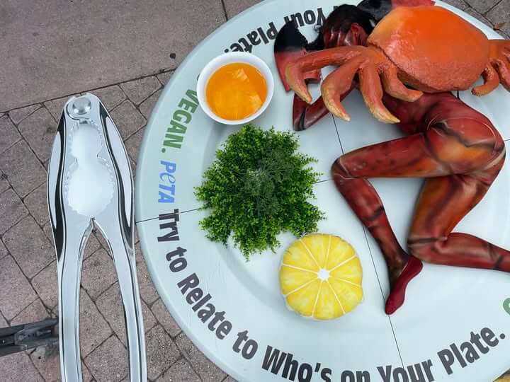 To expose this cruelty, PETA took on Joe’s Stone Crab in Miami Beach with a striking demonstration: A supporter covered in red body paint writhed atop a dinner plate while protesters stood nearby holding a banner that read, “It’s a Rip-Off! I Feel Pain, and I Need My Claws!”