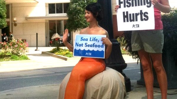 Lobsters, protesters, and a U.S. Marine throw up their arms (and claws) to protest Linda “Mean.”
