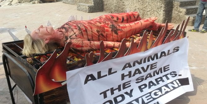 PETA India puts Ingrid E. Newkirk’s feet to the fire in an eye-catching demonstration in the country’s financial capital.
