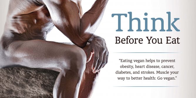 Elton John’s ex-bodyguard still looks buff in the buff, thanks to his vegan diet. He struck a pose for PETA’s latest ad urging people to think before they eat.