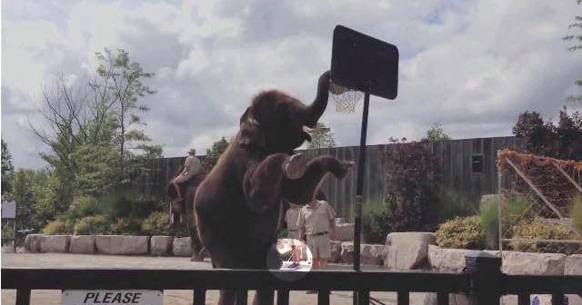 A video of an elephant named Chuck who stands on two legs and dunks a basketball with his trunk is making the rounds. But what’s the story behind it?