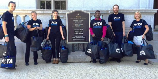 PETA members gave Congressional representatives water bottles embossed with facts about how meat and dairy production squanders water.