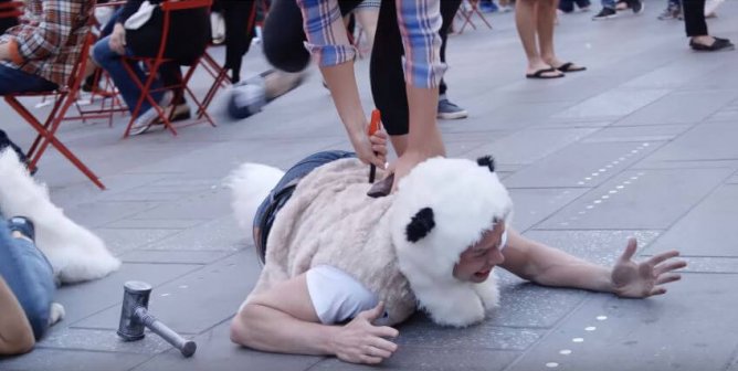 PETA’s street theater showing humans treated like sheep makes throngs of people in New York City stop in their tracks.