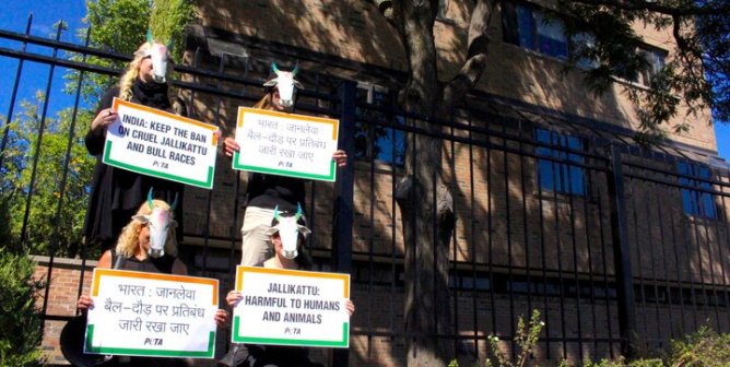 Herds of PETA “bulls” have been gathering outside Indian Embassies to tell the government not to legalize bull abuse.
