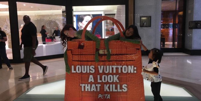 South Coast Plaza shoppers stopped and stared as two bodypainted “crocodiles” hung out of a purse that read, “Louis Vuitton: A Look That Kills.”