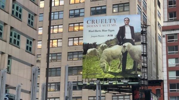PETA has placed a massive billboard featuring Joaquin Phoenix in Greenwich Village, just around the corner from where the shows will take place.