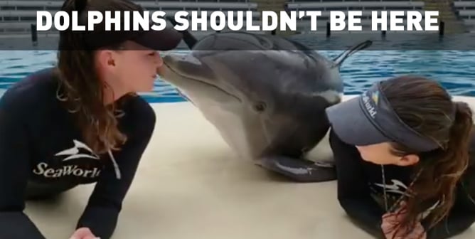 Dolphins don’t belong on a ledge between two trainers who force them to perform tricks—they belong in the ocean. Find out how to help them.