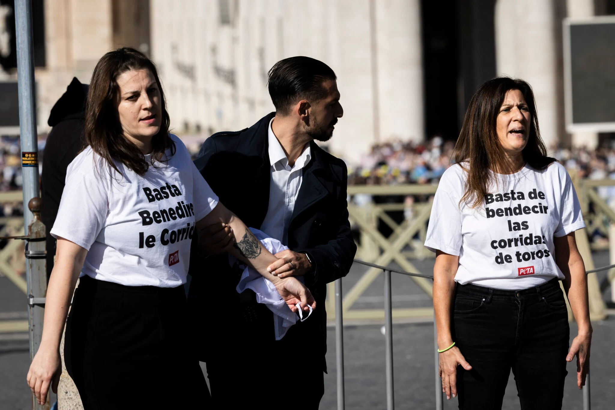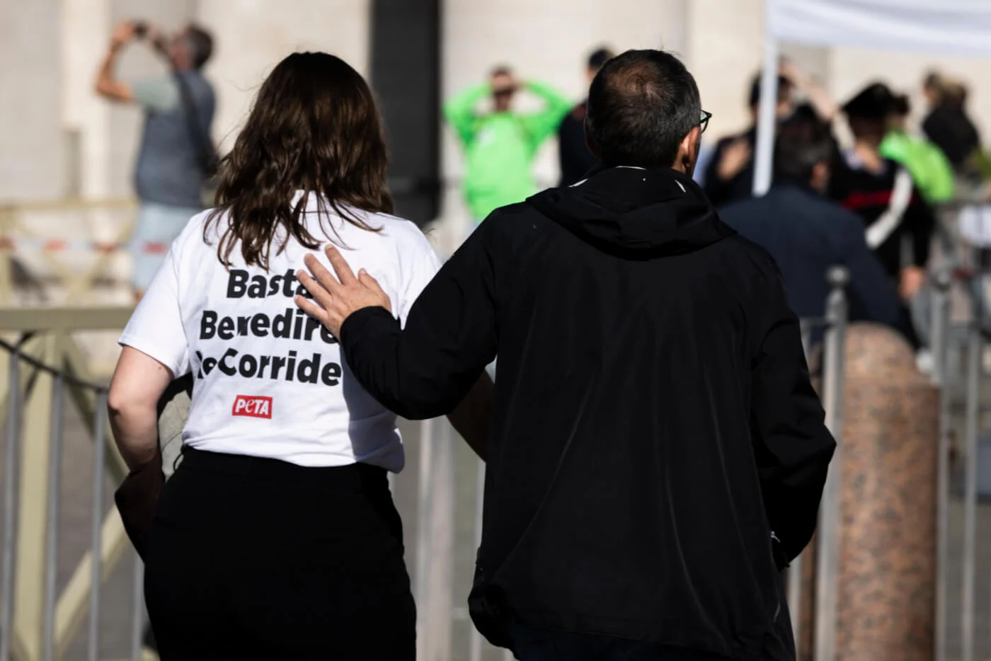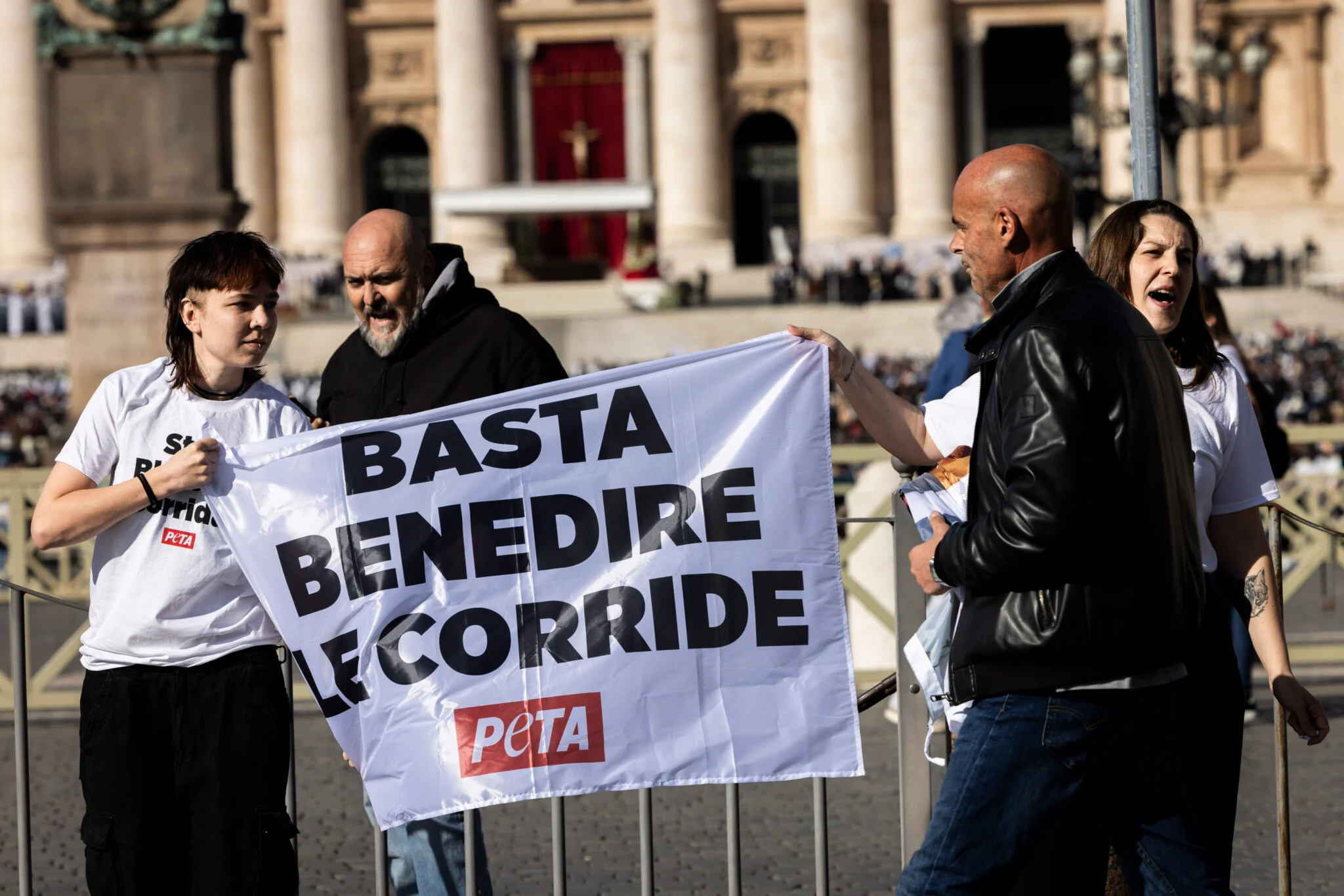 PETA supporters wearing t-shirts reading “Stop Blessing Corridas!” and holding a banner featuring Jesus proclaiming that torturing animals is a sin, were arrested in front of St Peter’s Square during the Jubilee of Consecrated Life as crowds of monks, nuns and priests looked on in shock.