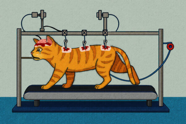Her experiments on cats in the early 1970s were similar to her current tests on rabbits: She removed part of cats’ brains, fixed the animals to “holders,” cut their backs, severed their spinal cords, implanted electrodes, and decapitated them.