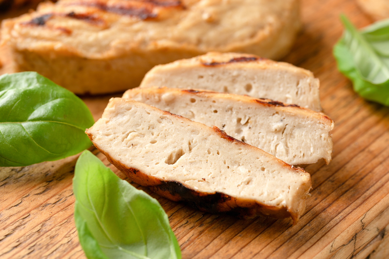 - Heat the oil in a large pan over medium heat. Add the “chicken,” mushrooms, basil, lemon, chives, and half of the wine. Sauté for 5 minutes, or until the “chicken” is heated through.